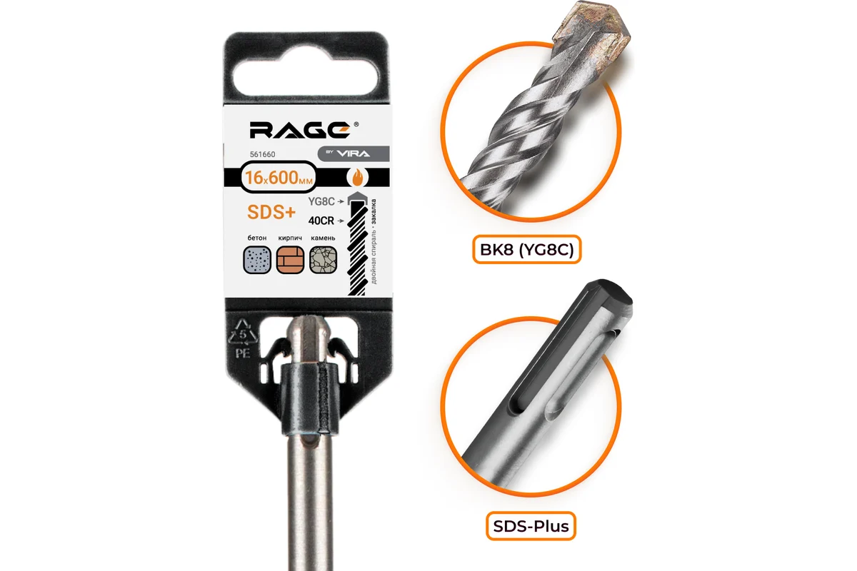 Серия буров RAGE by VIRA Бур для перфоратора является сменным элементом для перфораторов и отбойных молотков, имеющих тип патрона SDS+. Бур оптимизирован для ударного сверления отверстий в бетоне, камне, кирпиче. Эргономичная скользящая спираль способствует быстрому выводу шлама. Тело бура изготовлено из 40Cr, наконечник из YG8.