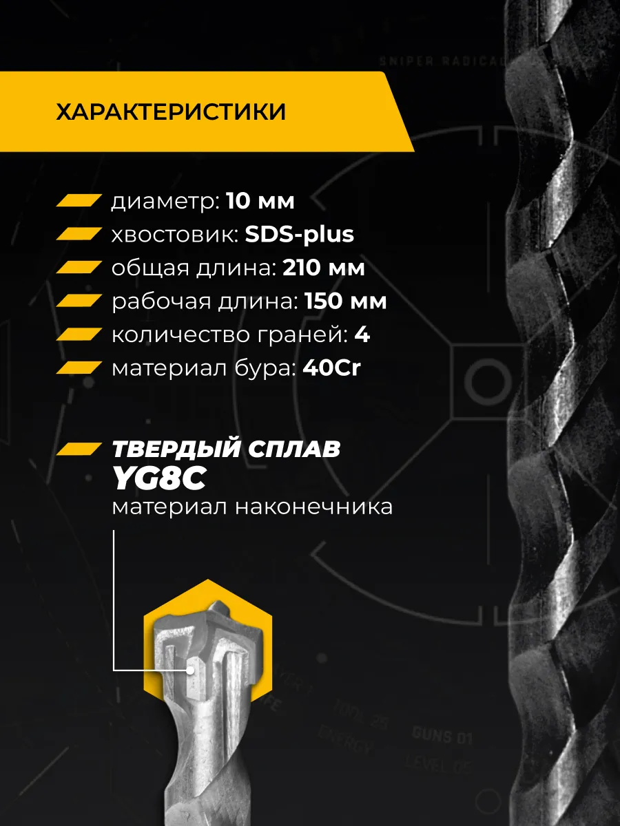Бур изготовлен из высокоуглеродистой стали, что повышает прочность и долговечность инструмента. Также бур имеет твердосплавные YG8С резцы, которые делают бур устойчивым к разрушениям.