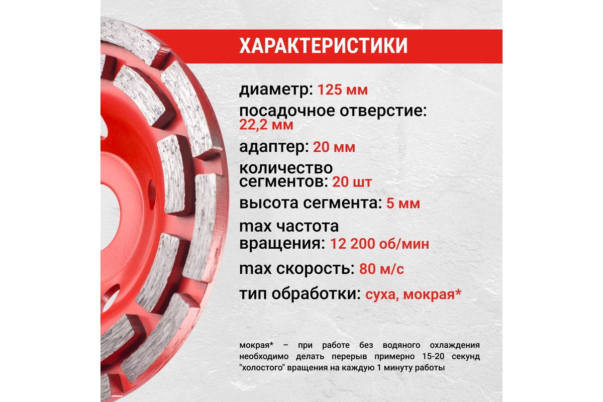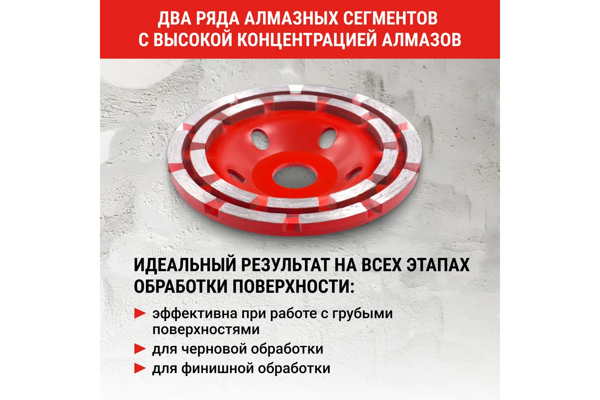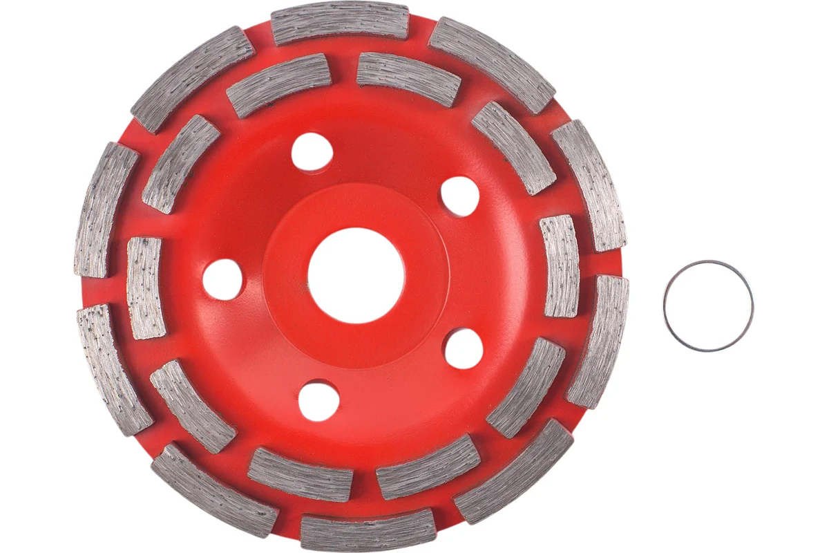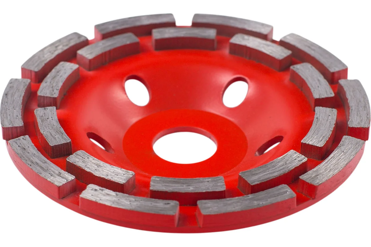 Чашка алмазная двухрядная предназначена для угловых шлифовальных машин и специальных алмазных шлифователях. Применяется для шлифования поверхностей из бетона, камня и кирпича. Двойная сегментированная поверхность чашки не требует водяного охлаждения во время работы.