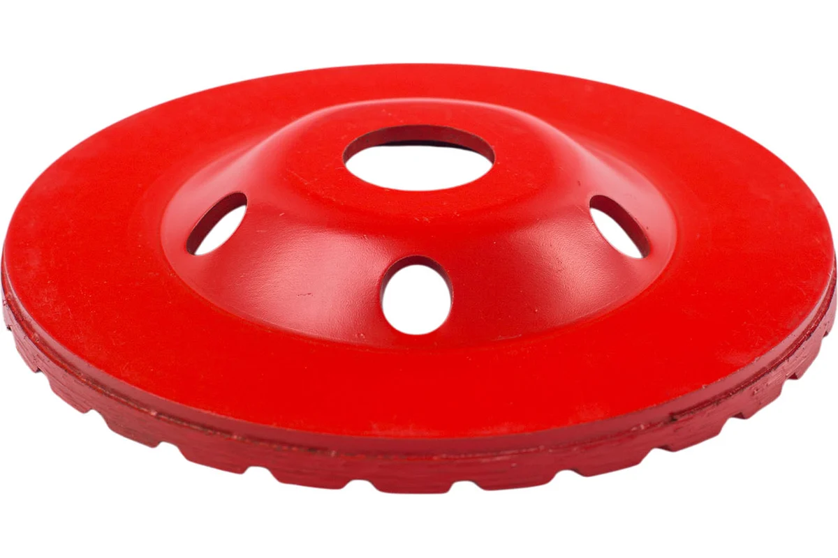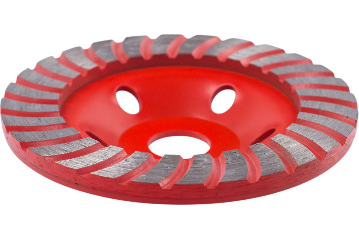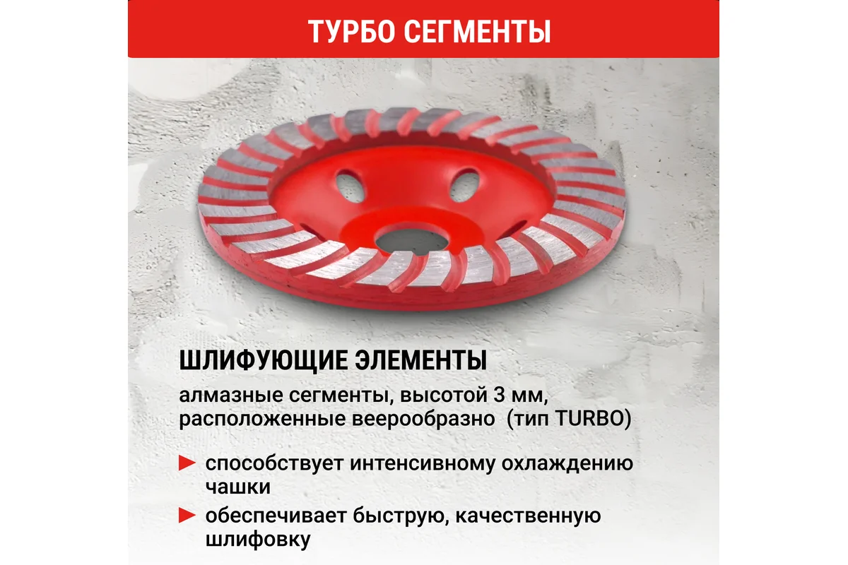 Чашка алмазная двухрядная предназначена для работы на угловых шлифовальных машинах и специальных алмазных шлифователях. Применяется для шлифования бетона, кирпича и камня. Корпус чашки представляет собой прочную отбалансированную металлическую основу. Шлифующими элементами являются алмазные сегменты, высотой 3 мм, расположенные веерообразно (тип TURBO). Подобное расположение сегментов способствует интенсивному охлаждению чашки и обеспечивает быструю, качественную шлифовку.