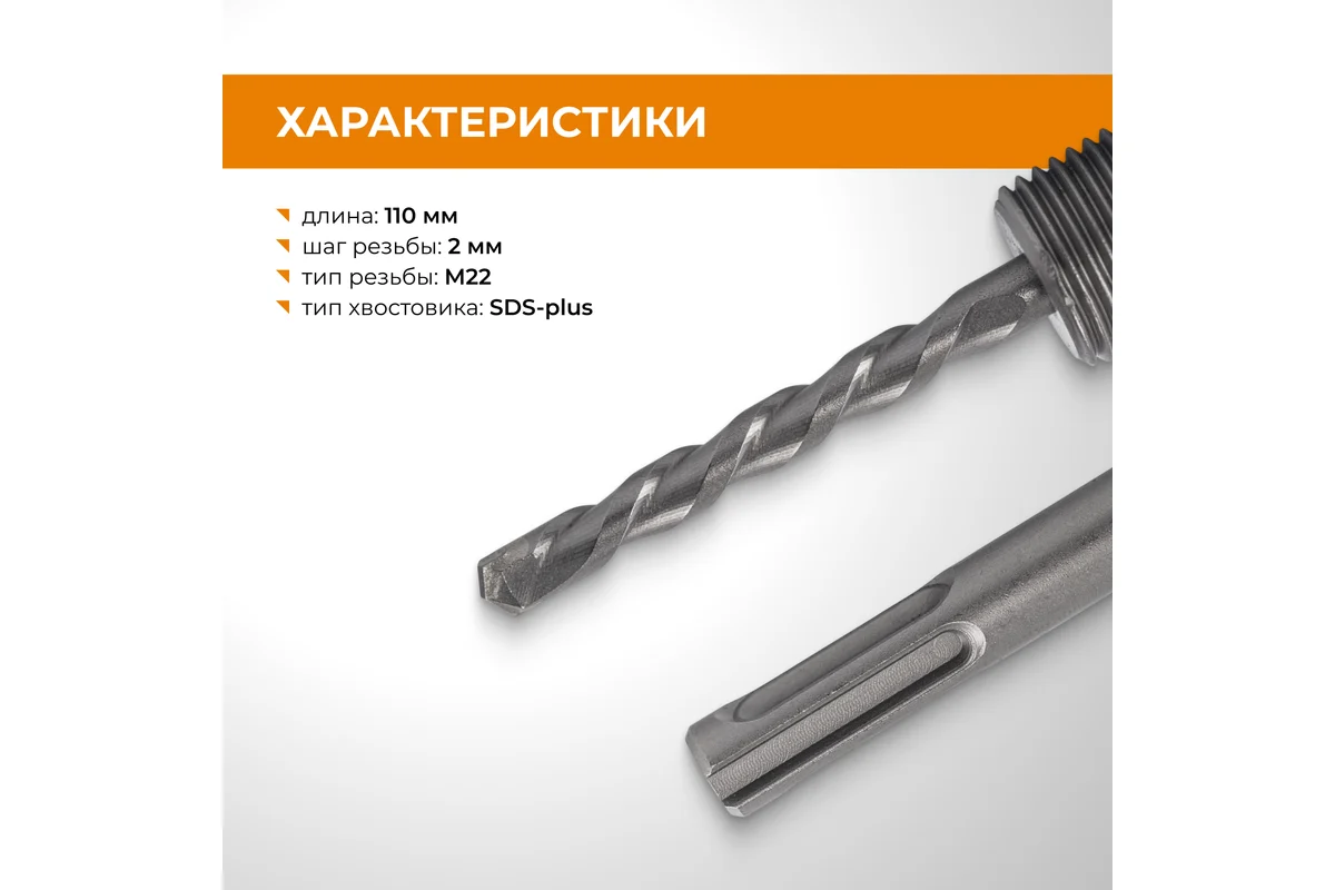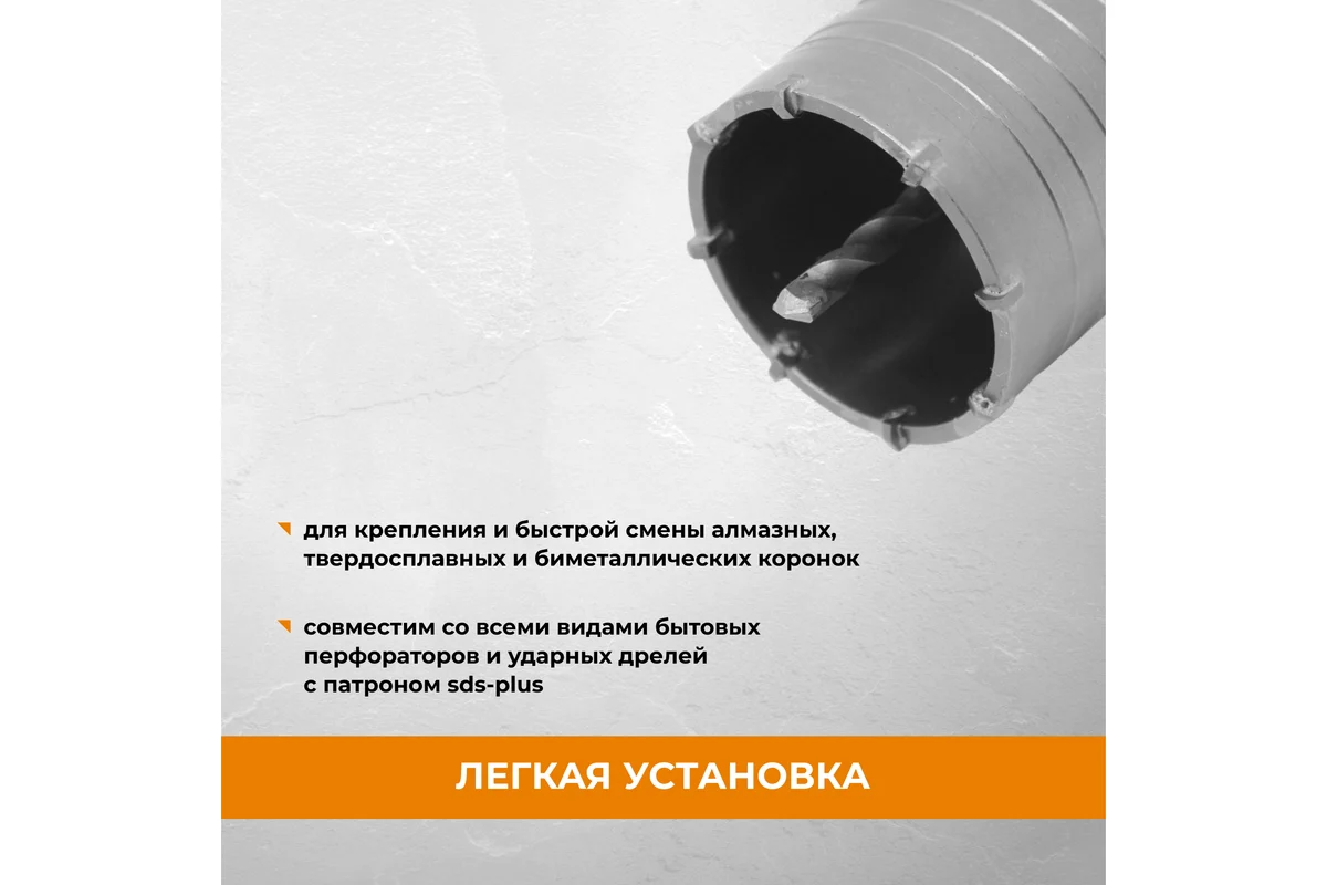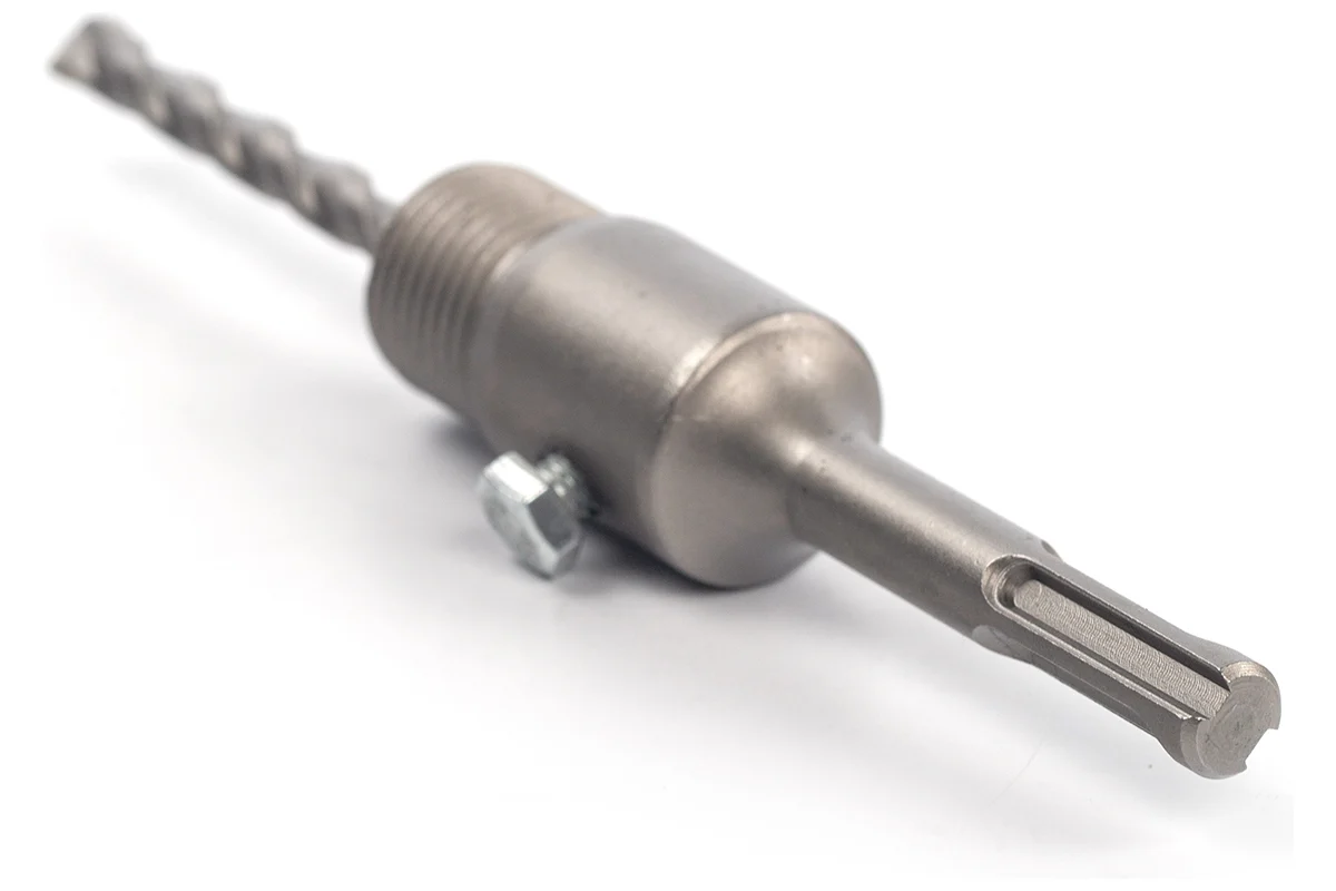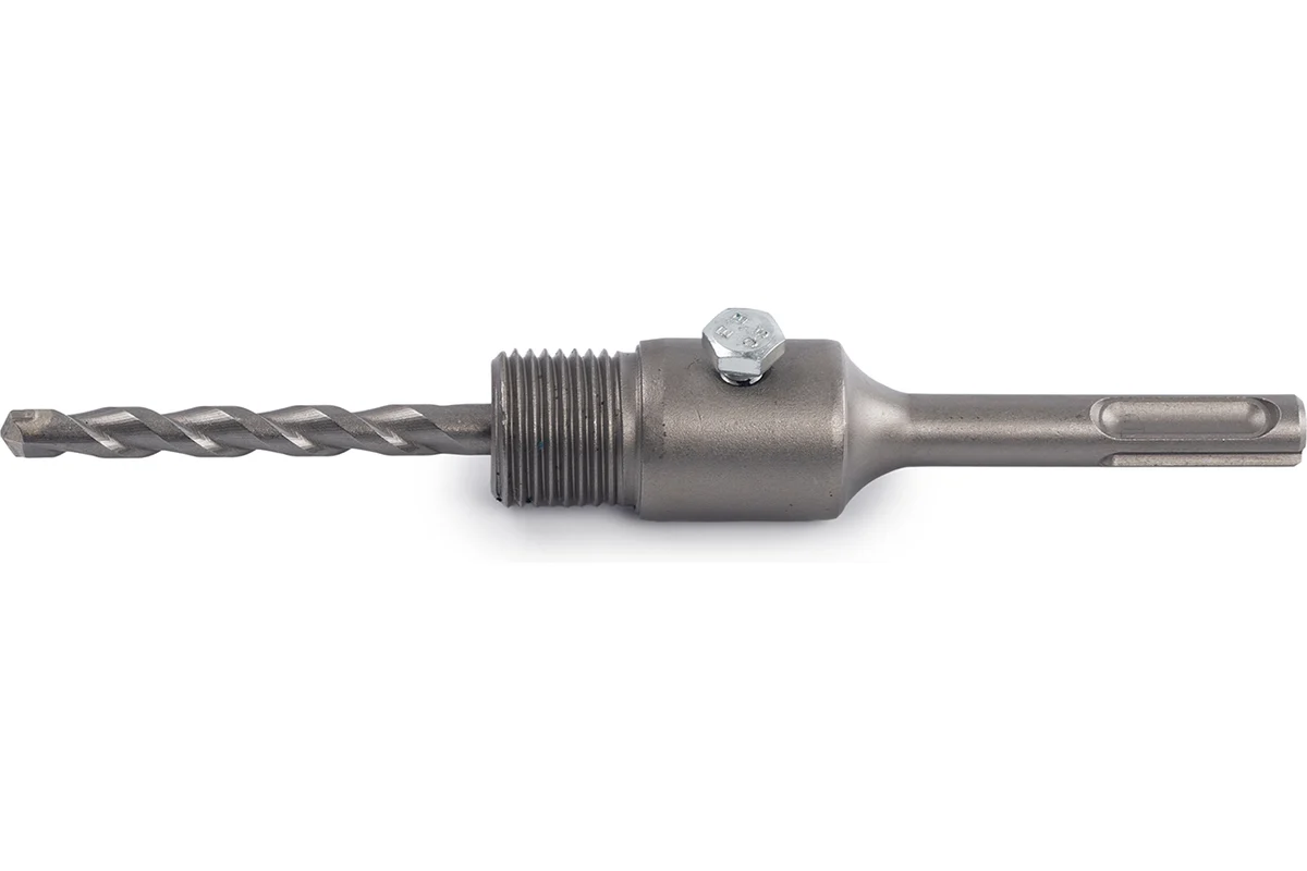 Держатель применяется для крепления и быстрой смены твердосплавных и биметаллических коронок за счет резьбового соединения М22 шаг резьбы 2мм. Фиксирующий болт обеспечивает надежную фиксацию в держателе центрирующего сверла или бура, с помощью которого отцентровать коронку при сверлении. Хвостовик SDS+ позволяет использовать держатель практически со всеми видами бытовых перфораторов и ударных дрелей с патроном данного типа. Держатель продается в комплекте с буром по бетону 8х110мм.