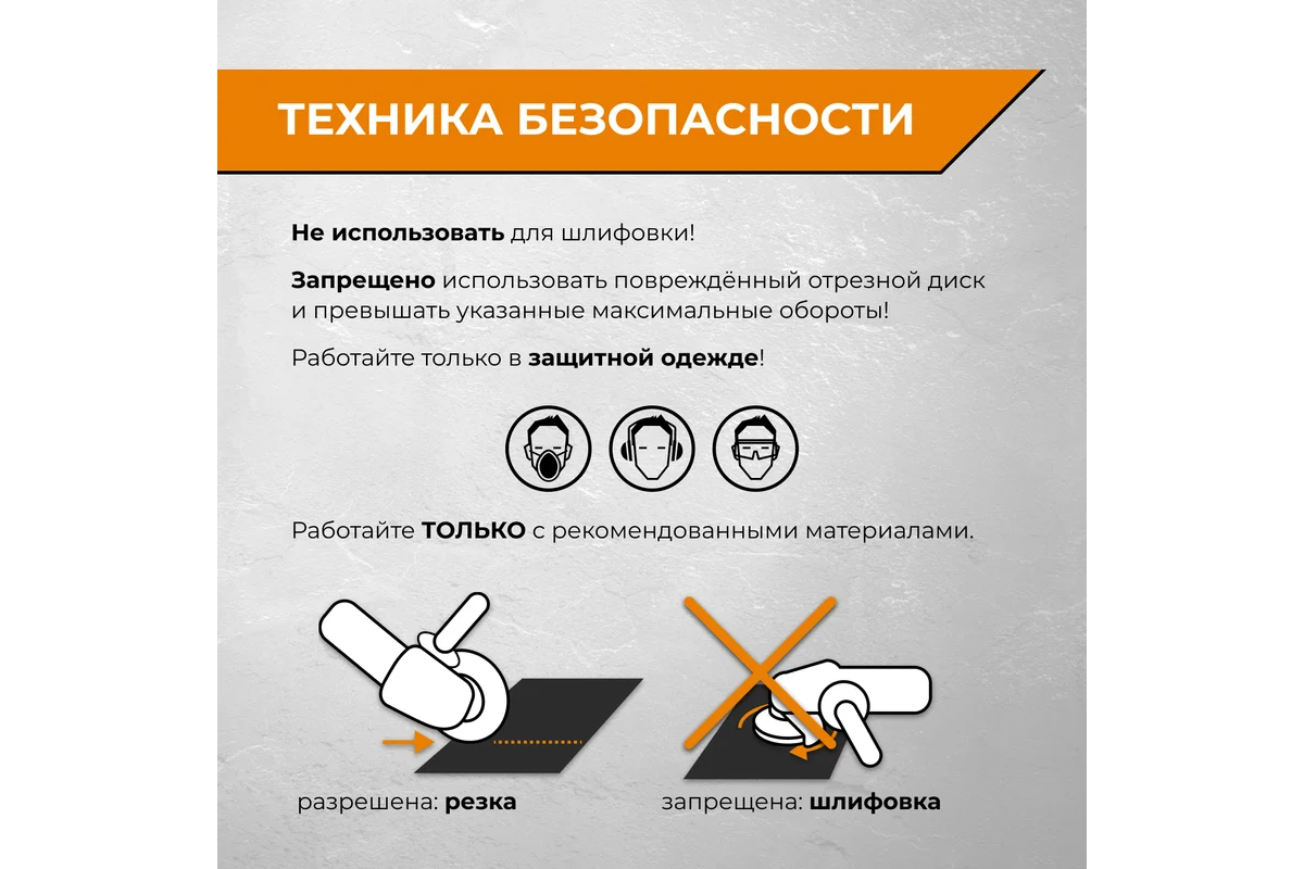 ВНИМАНИЕ! Не использовать для шлифовки! Работайте только в защитной одежде. Проверяйте надежность крепления диска на УШМ. Устанавливайте диск строго по направлению вращения. Запрещено использовать поврежденный отрезной диск и превышать указанные максимальные обороты.