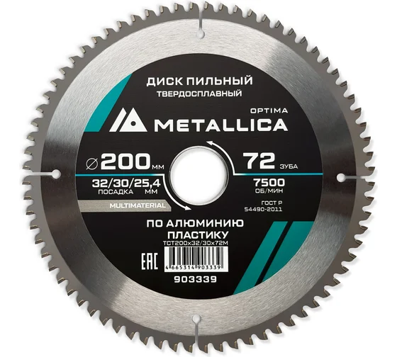 - Серия OPTIMA. Мод. TCT200x32/30x72M. Диаметр 200 мм, посадочное отверстие 32 мм, в комплекте 2 переходных кольца на 30 и 25,4 мм, ширина/глубина пропила – 2,6 мм/68-72 мм, 72 зуба, макс. скорость вращ. 7500 об/мин.