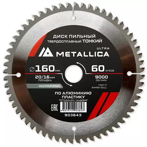 Диск пильный ТОНКИЙ Multimaterial тв/спл. предназначен для чистовой распиловки циркулярной пилой алюминиевого листа/профиля, мягких цвет. металлов, ламината/ламинированных ДСП/МДФ/фанеры, твердых пород дерева, паркета, тонкого пластика, пакетов материалов. Благодаря пониженному сопротивлению в материале особенно подходит для пил небольшой мощности и аккумуляторных пил. Изготовлен из пружинной стали 65Г с последующей закалкой до твердости 40-45 HRC. Имеет специальные прорези для компенсации теплового расширения. Металл-композитные тв/спл. режущие зубы из карбида вольфрама марки YG8X (K10) с содержанием кобальта 5,7% имеют повышенную твердость 92-93 HRA и износостойкость для длительной работы по деревосодержащим композиционным абразивным материалам(ламинат/ЛДСП). Зубы припаяны к корпусу серебряным припоем. Угол атаки зуба -5 гр для исключения залома кромки тонких материалов. Зубы имеют специальную чередующуюся алмазную заточку: черновой — трапециевидную, чистовой — прямую. Зубы припаяны с зазором 0,3 мм по высоте для исключения сколов по кромке реза. Малое расстояние между зубами обеспечивает аккуратную кромку при пилении алюминия, ламинированных материалов и тв. дерева поперек волокон. Не подходит для черных металлов и мягкого дерева. Рекомендован для профессионального применения Серия ULTRA. Мод. TCT160x20/16x60MT. Диаметр 160 мм, посад.отверстие 20 мм, в комплекте переходное кольцо на 16 мм, ширина/глубина пропила 2,0/52-55 мм, 60 зубов, max ск. вращ. 9000 об/мин.