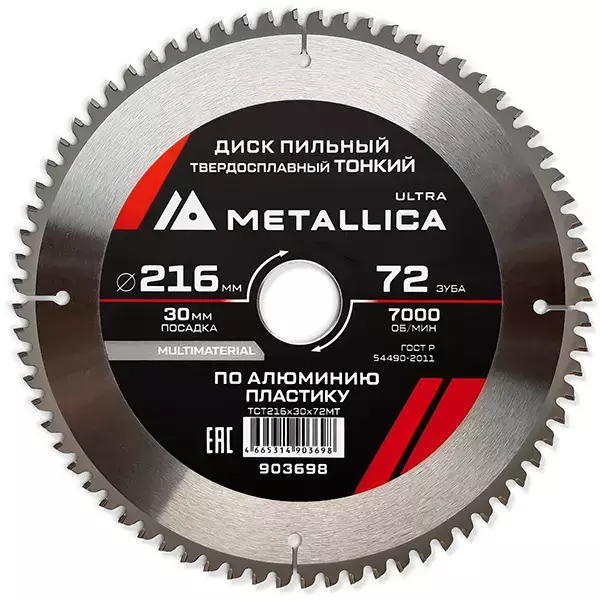 - Серия ULTRA. Мод. TCT216x30x72MT. Диаметр 216 мм, посадочное отверстие 30 мм, ширина/глубина пропила 2,2/65-70 мм, 72 зуба, max ск. вращ. 7000 об/мин.