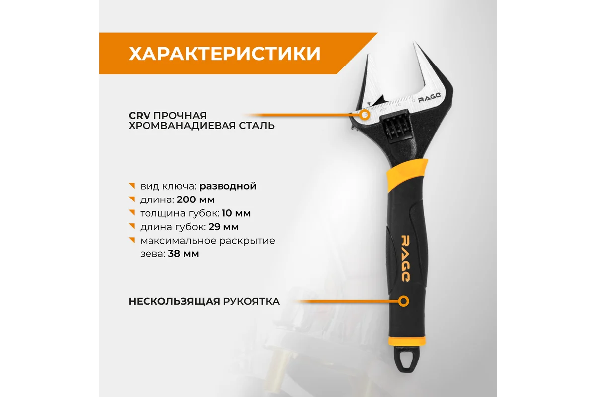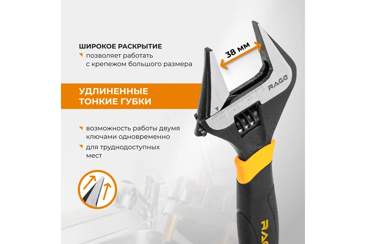 Ключ разводной RAGE 200 мм с тонким губками и защитными насадками 311106