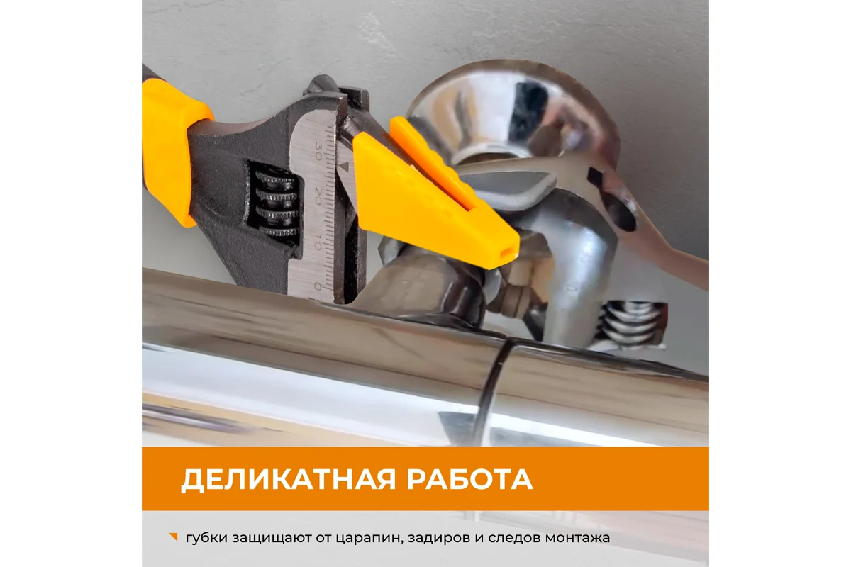 Разводной ключ предназначен для монтажа и демонтажа крепежных элементов и сантехники. Подвижная губка позволяет подстраиваться под разные размеры крепежа. Расширенный зев позволяет работать с крепежом большего размера. Тонкие удлиненные губки удобны при работе в труднодоступных местах и ограниченном пространстве, особенно удобны при необходимости использования двух ключей одновременно. Материал инструмента — хром-ванадиевая сталь с закалкой, которая обеспечивает высокую прочность и долговечность. А также ключ имеет защитное покрытие от коррозии и защитные насадки. Противоскользящая рукоятка облегчает удержание и обеспечивает работу с большим усилием.