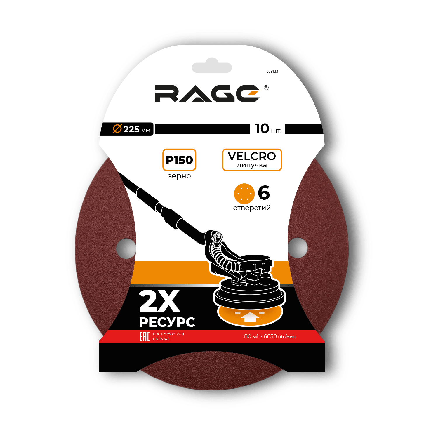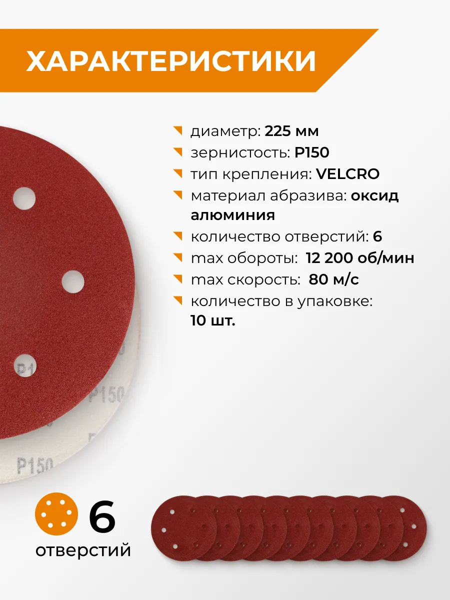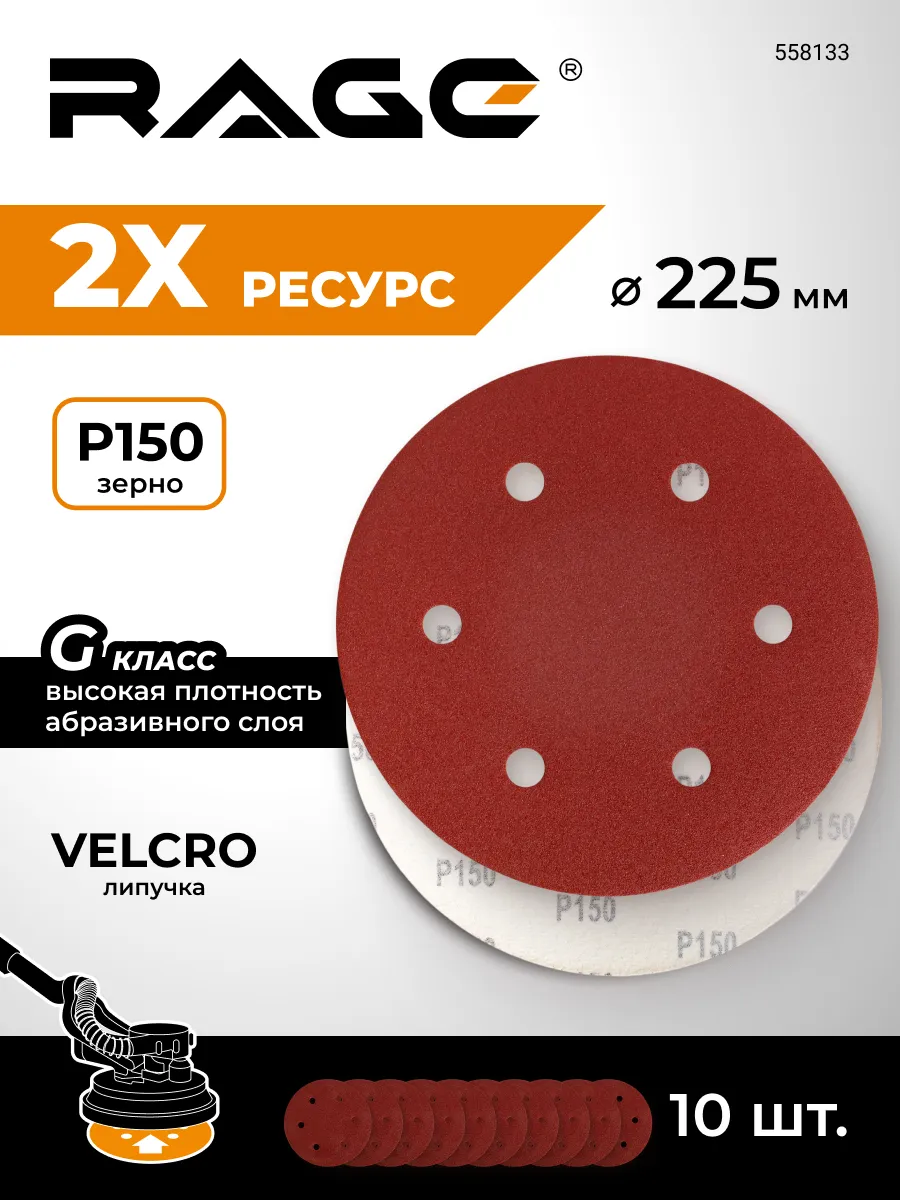 Круги шлифовальные 225 мм Р150 6 отв на липучке 10 шт RAGE 558133