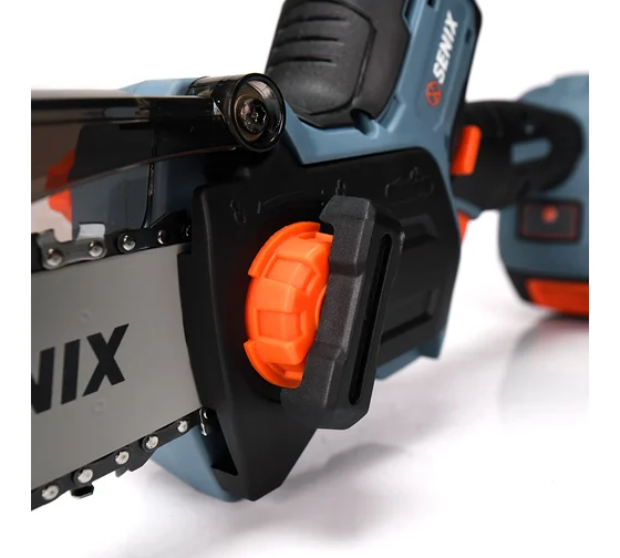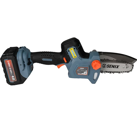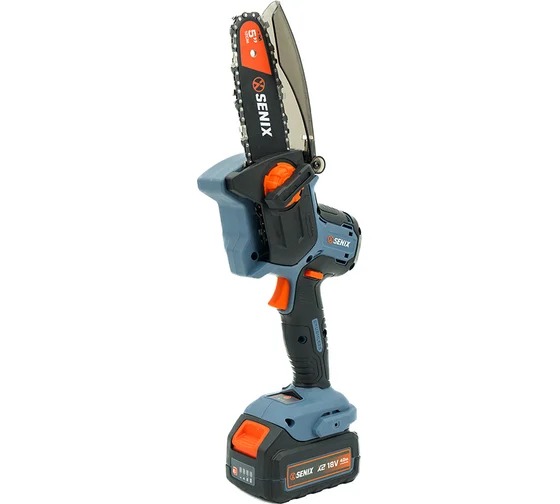 Пила цепная аккумуляторная, напряжение 18В, шина 12 см (5»), скорость цепи: 11 м/с, бесключевая смена и натяжение цепи.