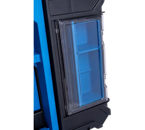 - Верхний, запираемый ящик имеет съемный лоток, в крышке размещены 2 органайзера с прозрачной крышкой для хранения мелких деталей и аксессуаров, каждый со съемными перегородками