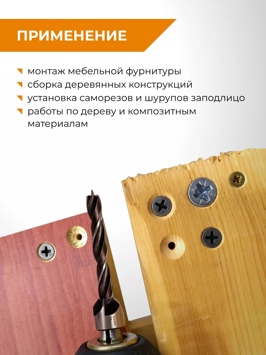 Данный набор предназначен для создания аккуратных отверстий с одновременным зенкованием в древесине, ДСП и фанере.