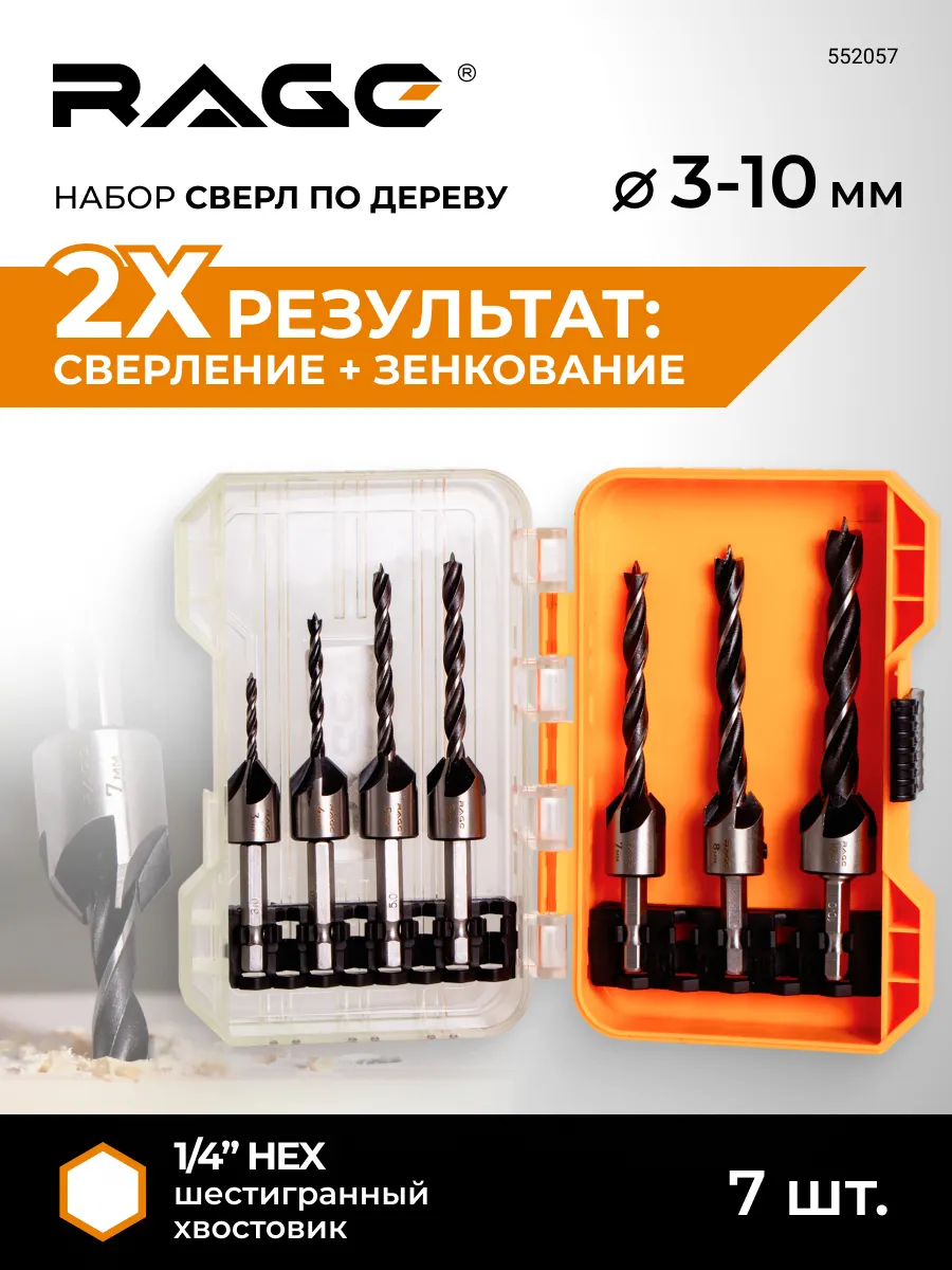 Набор сверл по дереву с зенкером 3-10 мм 7 шт RAGE 552057