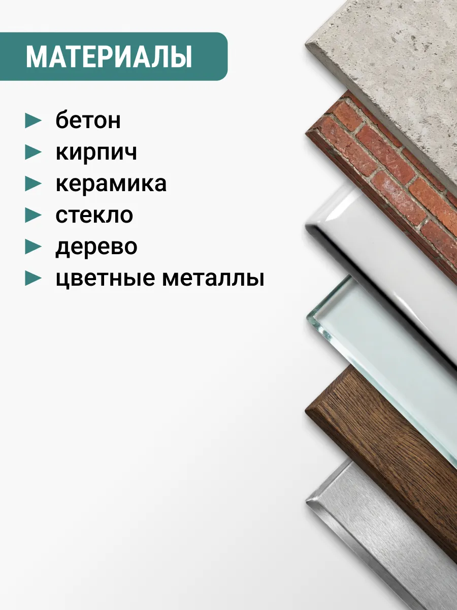 Материал обработки: бетон, кирпич, керамика, стекло, дерево, цветные металлы;