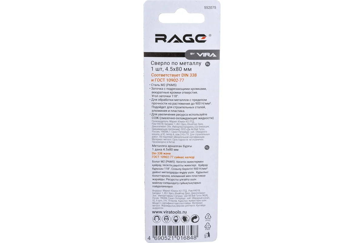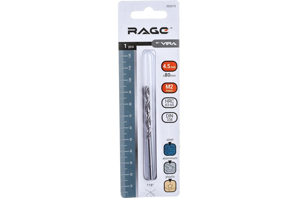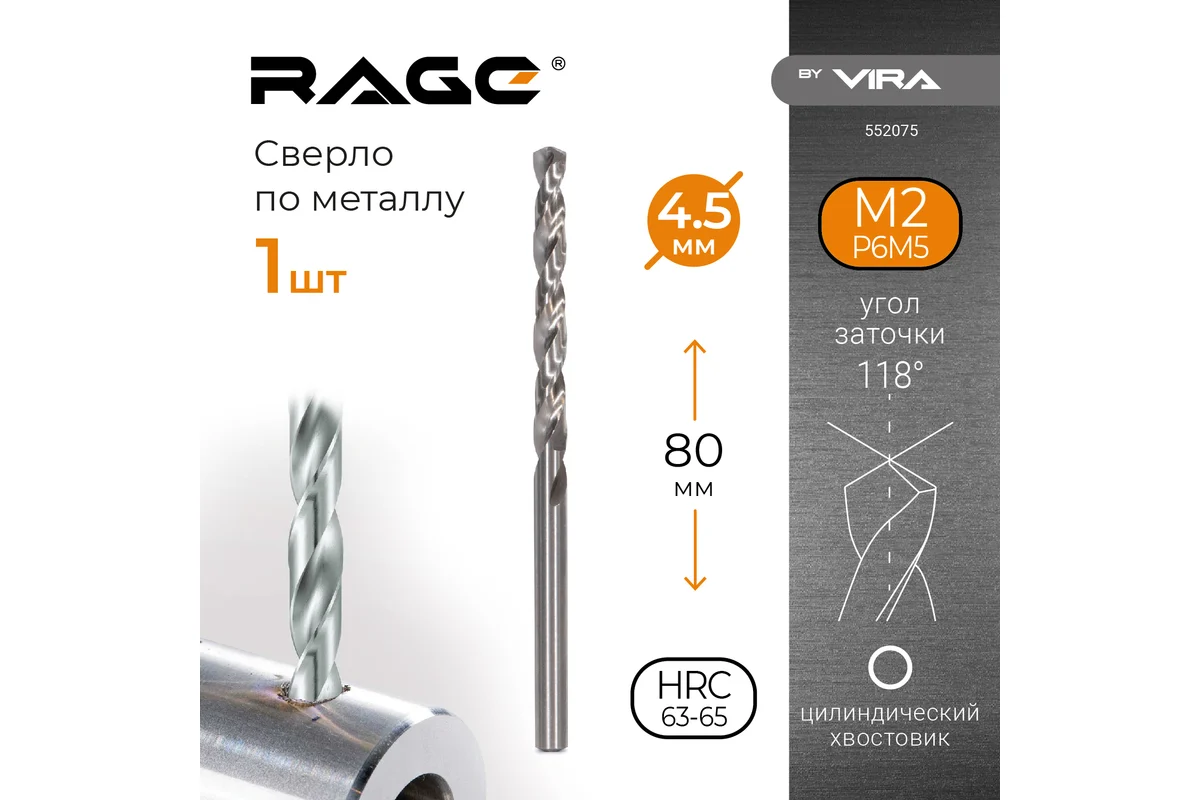 Сверло по металлу 4,5 мм P6M5 1шт. RAGE by VIRA
